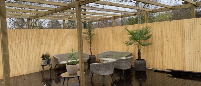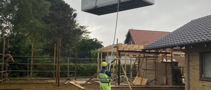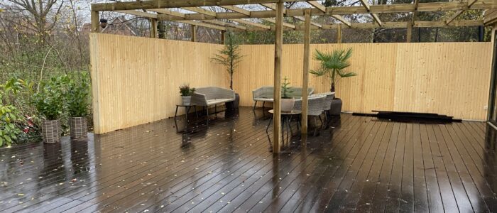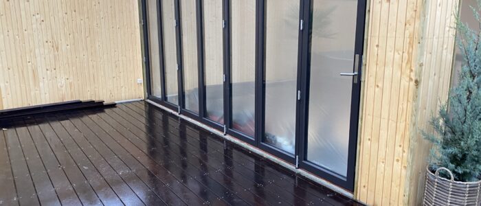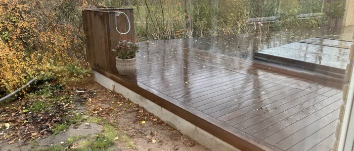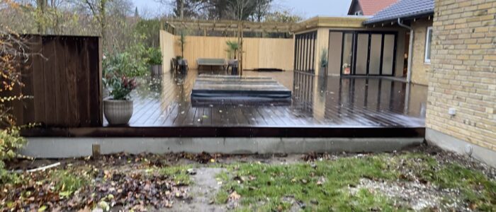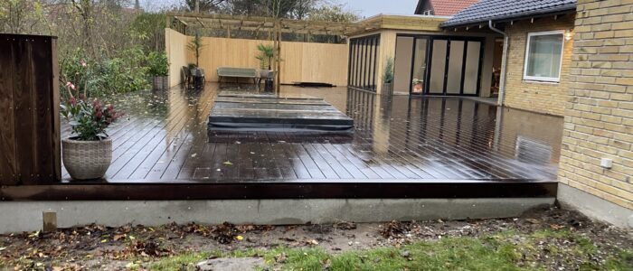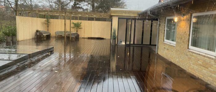 Dette spændende renoverings og tilbygningsprojekt har gennemgået en totalrenovering af huset samt tilbygget et mindre træningsrum og udenfor er der bygget en stor træterrasse med svimspa og udebruser. Eksisterende garage er ombygget med èn stor port.